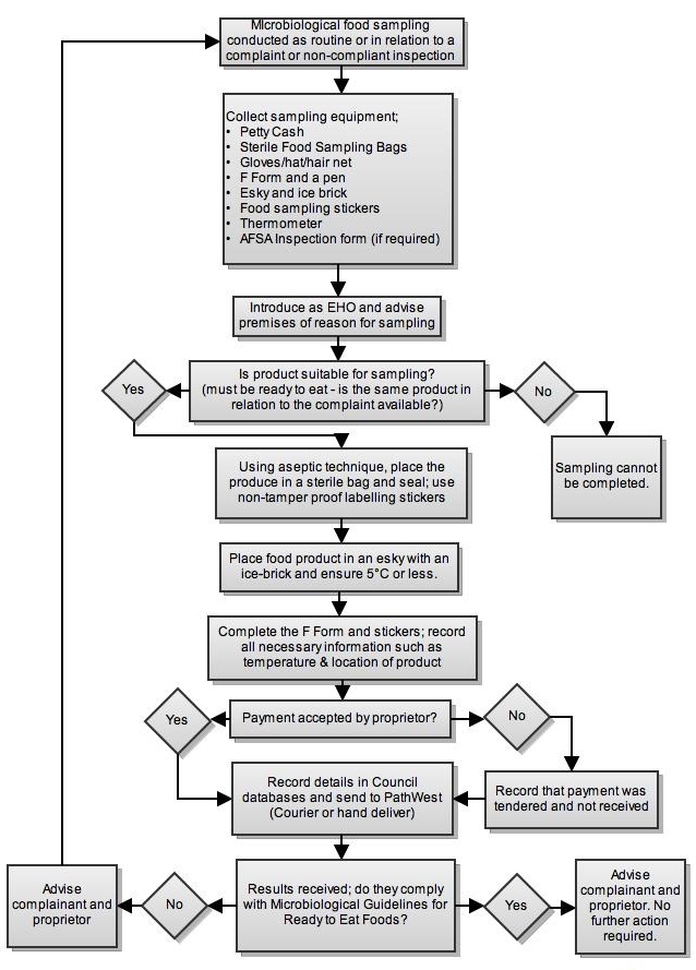 Microbiological sampling is conducted to test for pathogens in food products, this may be done in response to a complaint or to obtain further information about a premises (E.g. to determine temperature abuse, inadequate hand washing etc).