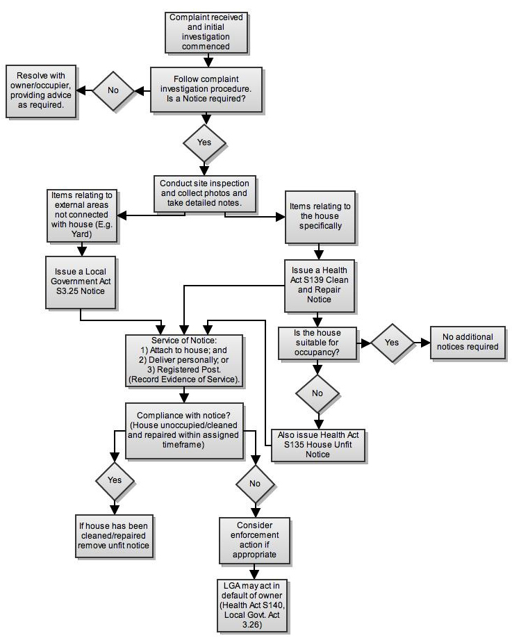 A number of complex issues are often involved with house unfit and hoarding complaints such as mental health concerns and safety of children and other family members involved. It may be important to involve a number of agencies and action taken will vary depending on a number of factors such as occupancy of the premises and cooperation of the owner/occupier. Unfit houses have the potential to cause a number of health concerns for both the neighbours and occupants by means including; presence of pests, inadequate power, water or wastewater provisions and unsafe, unclean or damaged premises.