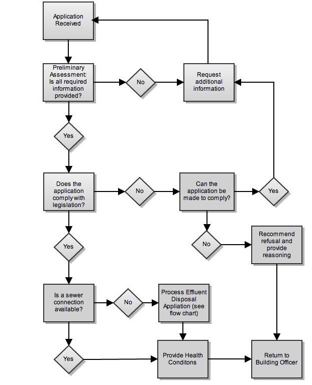 Health Services assess building applications for compliance with relevant Environmental Health Legislation. Specifically, these are usually assessed where onsite effluent disposal is required or where a health premises is being established.